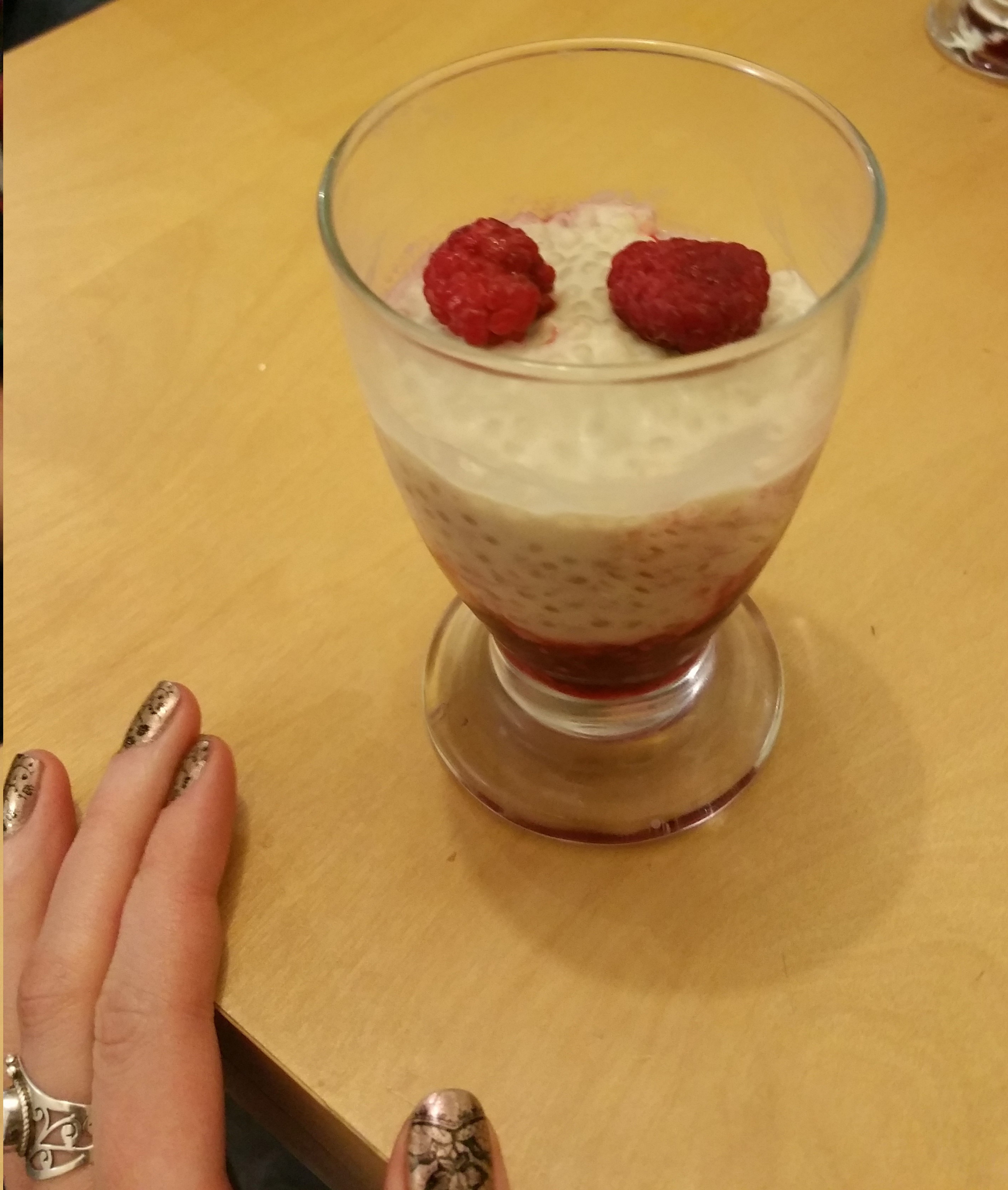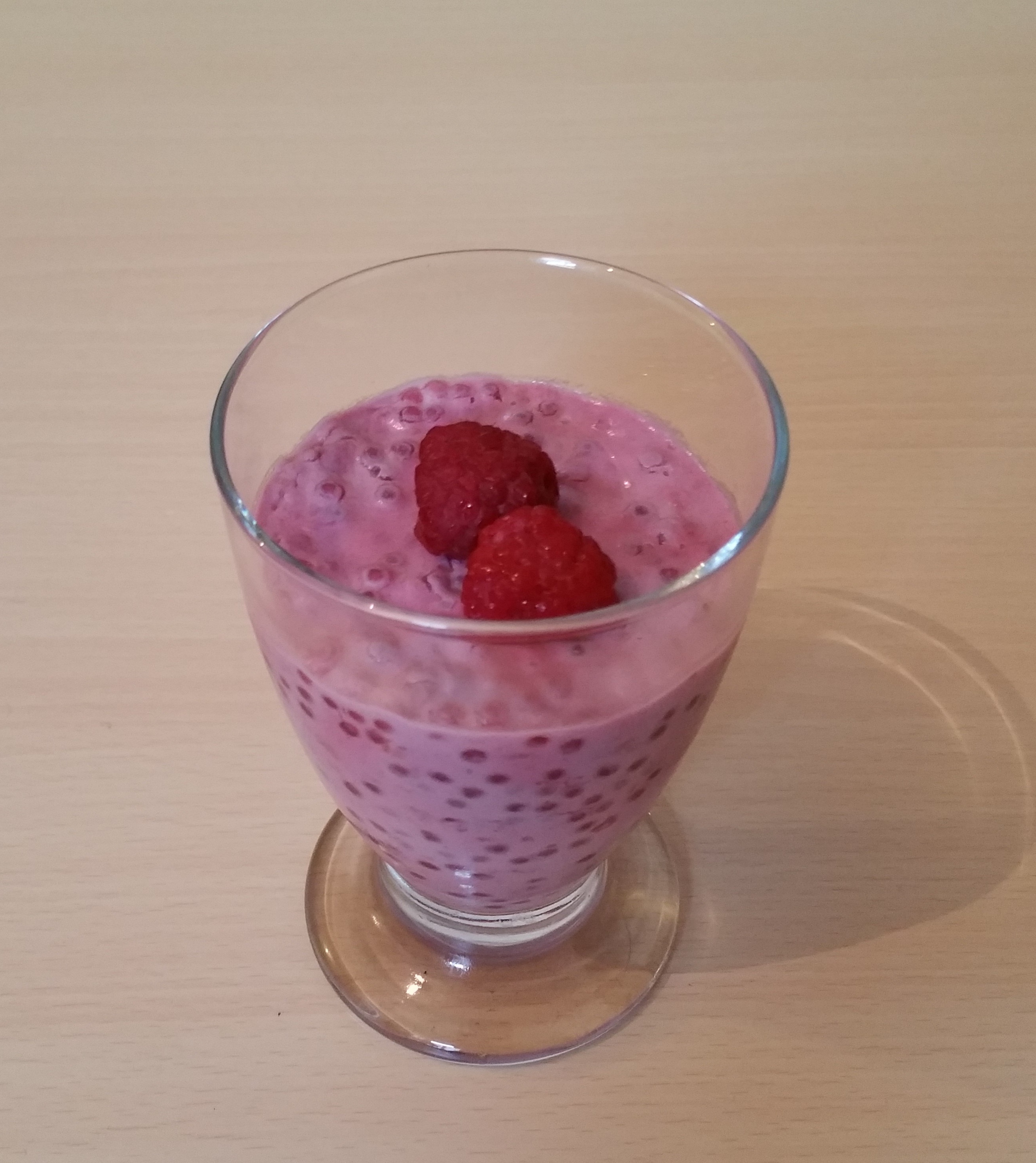 Perles du japon au lait de coco et coulis de framboises