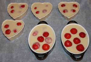 - Versez la préparation et ajoutez encore quelques fraises pour qu’elles ressortent bien à la surface