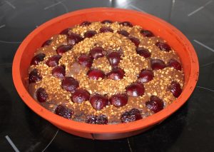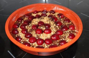 - Ajoutez les cerises (personnellement je les ai dénoyauté avant) et saupoudrez de pralin à votre convenance