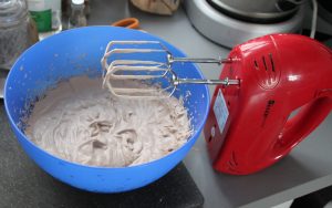 - Mélanger au sucre glace et fouetter au batteur électrique 3 à 5 min jusqu’à l’obtention d’une chantilly aérienne