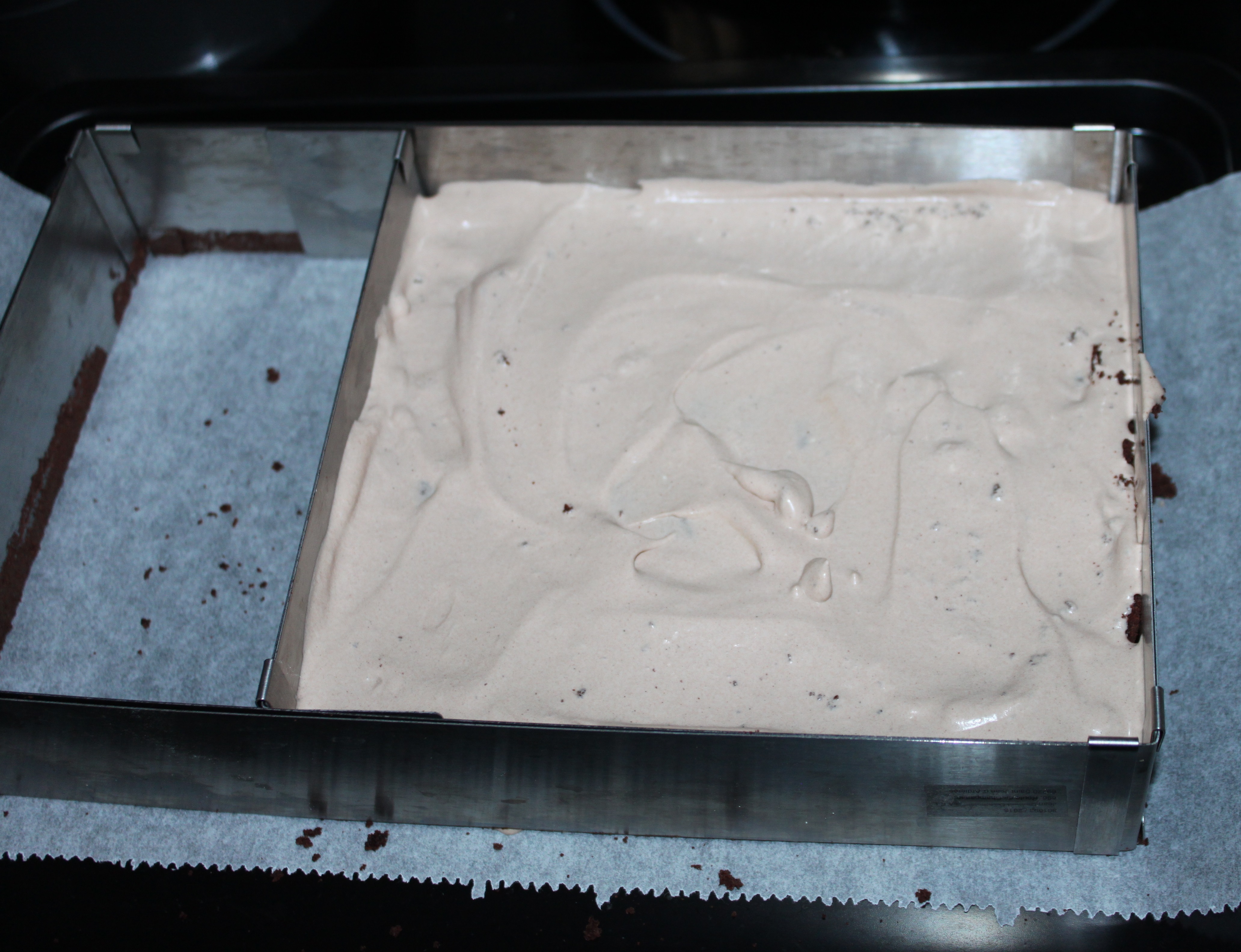 - Recouvrir le fond d’un cadre avec une première couche de base cookies. Ne pas hésiter à casser la base cookie pour combler la majorité des trous ; ce n’est pas grave s’il reste des trous