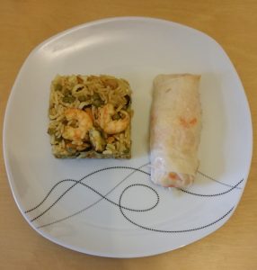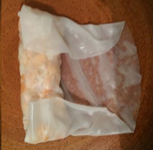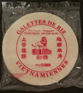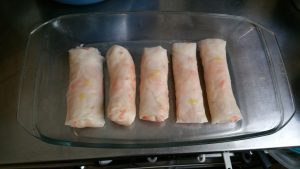- Pour les feuilles de riz : l’opération est en réalité très simple. Si vous n’avez jamais roulé des nems je vous conseille de regarder cette vidéo de moins de 2 minute et reproduire la méthode : https://www.youtube.com/watch?v=HGoj8TP_7-U. Prenez une grande assiette creuse (ou un moule à gâteau pour ma part…), versez-y de l’eau bien chaude (mais pas bouillante, attention à vos doigts!). Laissez tremper une feuille à la fois quelques secondes ; retirez-là, puis étalez là doucement sur un torchon qui absorbera l’excédent d’eau. Ensuite, posez là sur une surface plate, puis mettez une partie de la préparation du saladier ; ensuite on plie comme une fajitas et le tour est joué ! Attention les feuilles de riz sont fragiles et redeviennent rapidement rigides.
